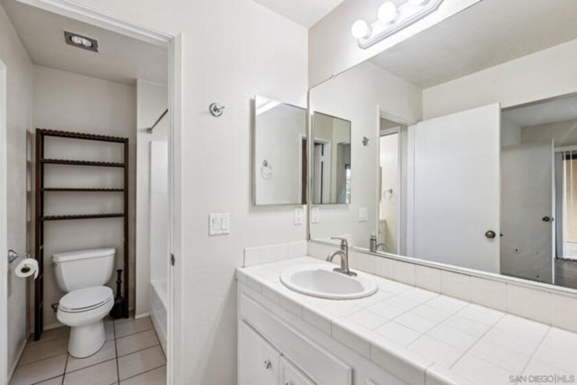 What is not to love about this amazing ground floor unit at Avocado Village! Prime location near the community pool and spa with your assigned parking space and detached 1-car garage located just outside your unit. The one car garage measures just over 24 feet deep and has built-in cabinets for additional storage. Step inside your home and you'll find beautiful wainscoting paneling throughout the living room and dining areas along with a fireplace and a buffet seating area at the kitchen entrance giving the space an open and entertaining feel. The kitchen has white shaker cabinets with matching white appliances. In-unit stackable washer and dryer for added convenience. Throughout the living room, dining area, kitchen and bedrooms you have beautiful vinyl tile flooring. Access to your private covered patio from either the living room sliding glass doors or the primary bedroom sliding glass doors. Central heat & AC will keep you comfortable all year long. The bathroom set-up is fantastic with direct access from the primary bedroom with its own sink/vanity area, and access from the hallway with its own sink/vanity area. Amazing overall location with McGrath Family YMCA, shops, and dining at the Rancho San Diego Towne Center. Less than 20 minute drive to downtown San Diego.
