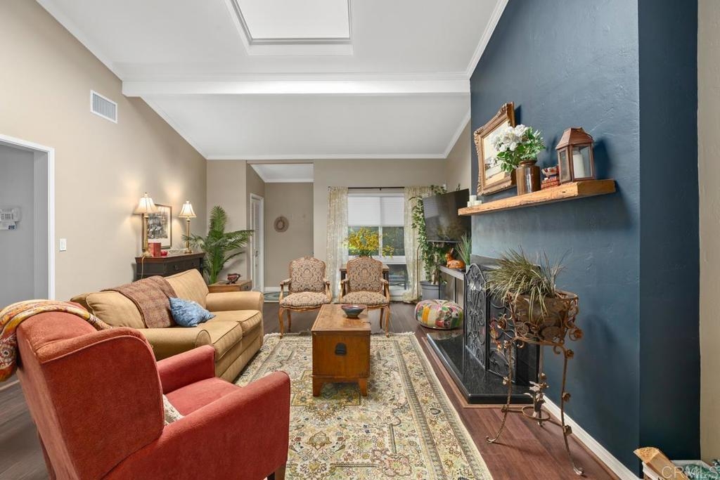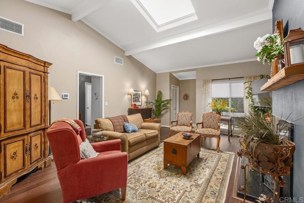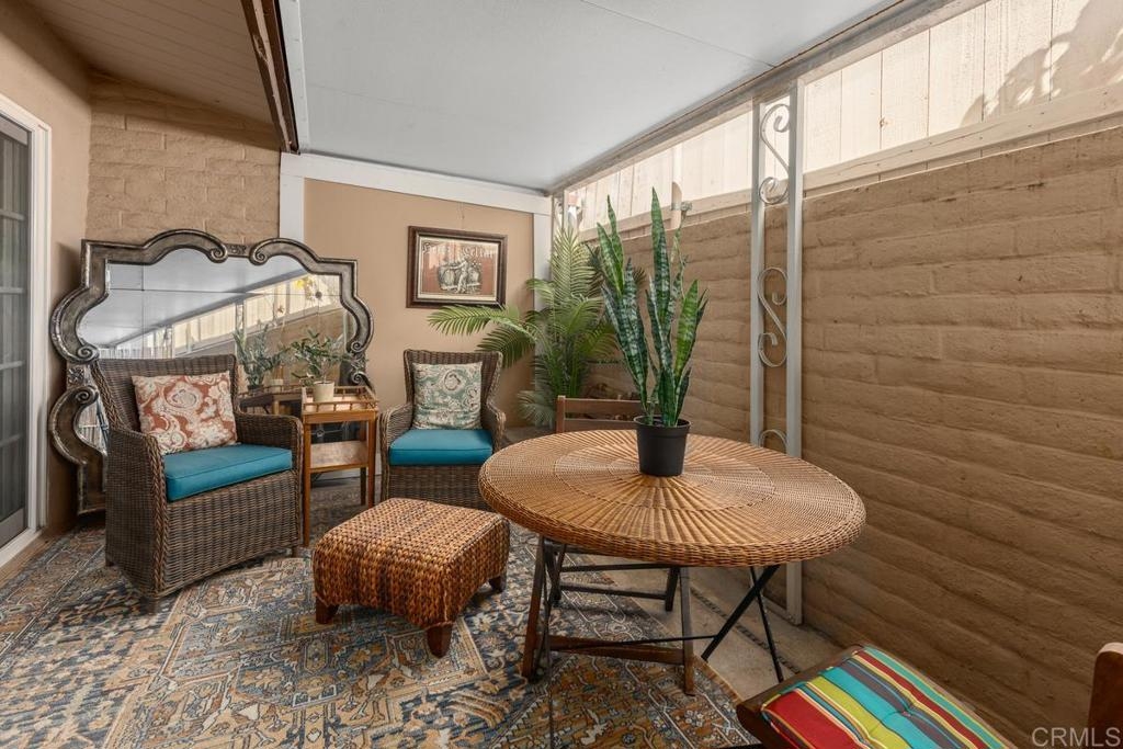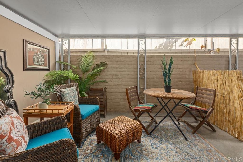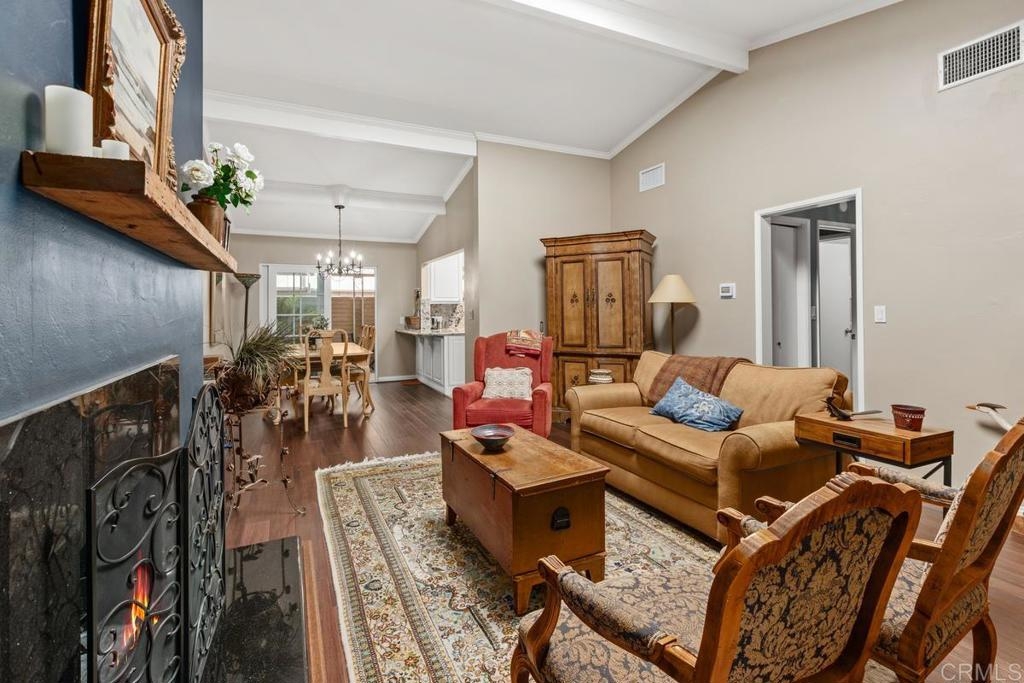 Welcome to a truly warm and inviting home! This spacious end unit has been upgraded with new wood flooring, updated kitchen, newer furnace and air conditioner, new fireplace mantle and more! Huge patio is perfect for entertaining and there is LAUNDRY on the patio. Vaulted ceiling with skylight in the living room floods the space with natural light. Exclude curtains in living room and bedrooms as well as two sconces in primpary bedroom. 2 dogs allowed not to exceed 30lbs. Parking space is 6H (carport). Complex is FHA approved and can go VA!
