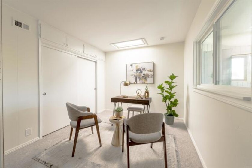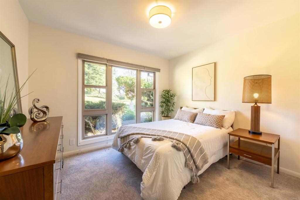 Welcome to this beautifully updated, single-level end-unit condo in Grossmont Village. Set within a serene, park-like setting with meandering walking paths, mature landscaping, a sparkling swimming pool, and a welcoming clubhouse, this special residence offers the perfect blend of comfort, convenience, and lifestyle. Single-level living is a rare find in San Diego, and this thoughtfully upgraded home truly stands out. As an end unit, it enjoys added privacy and abundant natural light, enhanced by skylights that brighten the interior spaces. The inviting living room features a charming wood-burning fireplace, creating a warm and comfortable focal point for relaxing or entertaining. The interior has been freshly painted throughout, including doors and trim, and features upgraded electrical, new light fixtures, and a beautifully updated bathroom. The home showcases wood-tone tile flooring that mimics the look of hardwood, complemented by brand-new carpet in the bedrooms. Dual-pane windows enhance energy efficiency and comfort throughout the home. The enclosed patio adds valuable additional living space—ideal as a sunroom, reading nook, or flexible extension of the living area. Just beyond the front windows, enjoy views of your own private courtyard, perfect for creating a garden, outdoor seating area, or peaceful front patio retreat. The second bedroom offers exceptional flexibility, featuring a folding pull-across wall that allows the space to function easily as a bedroom, home office, family room, or den. Additional upgrades include a newer roof, water heater and a newer HVAC system, providing peace of mind and year-round comfort. Conveniently located within walking distance to the Grossmont trolley stop, this home offers easy access to public transportation, shopping, dining, and nearby amenities—making it an ideal choice for both owner-occupants and those seeking a low-maintenance, well-connected lifestyle. A rare single-level condo in a tranquil, resort-like community—this Grossmont Village home is truly something special.