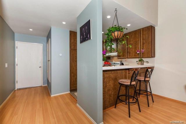 Rarely available bright and spacious one story end unit condominium. Inside are dramatic vaulted wood beam ceilings, with multiple of skylights allowing light shafts to radiate throughout the rooms. Open floor plan is conducive for easy entertaining. Two good-sized bedrooms and 1 1/4 bathroom. There is also a roomy balcony with no one behind allowing for great views! Interior doors are stunning handmade etched glass. The unique details in this charming unit are unforgettable!! One car garage, and one reserved parking space help make this home unique. Low HOA & great pool, jacuzzi & tennis courts, La Mesa Swim & Tennis Club. New furnace/AC system & water heater. Please call Listing Agent with any questions: Elizabeth Raber (805)680-5855.