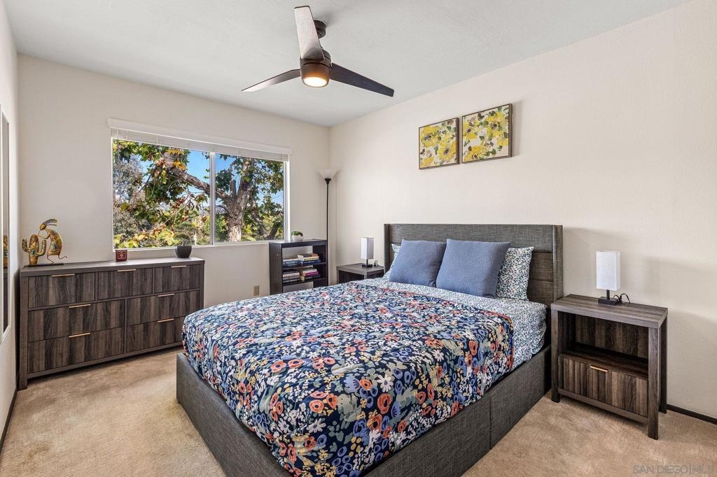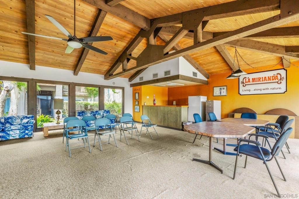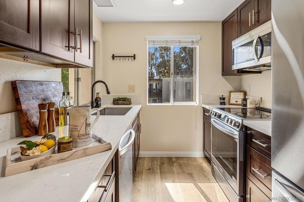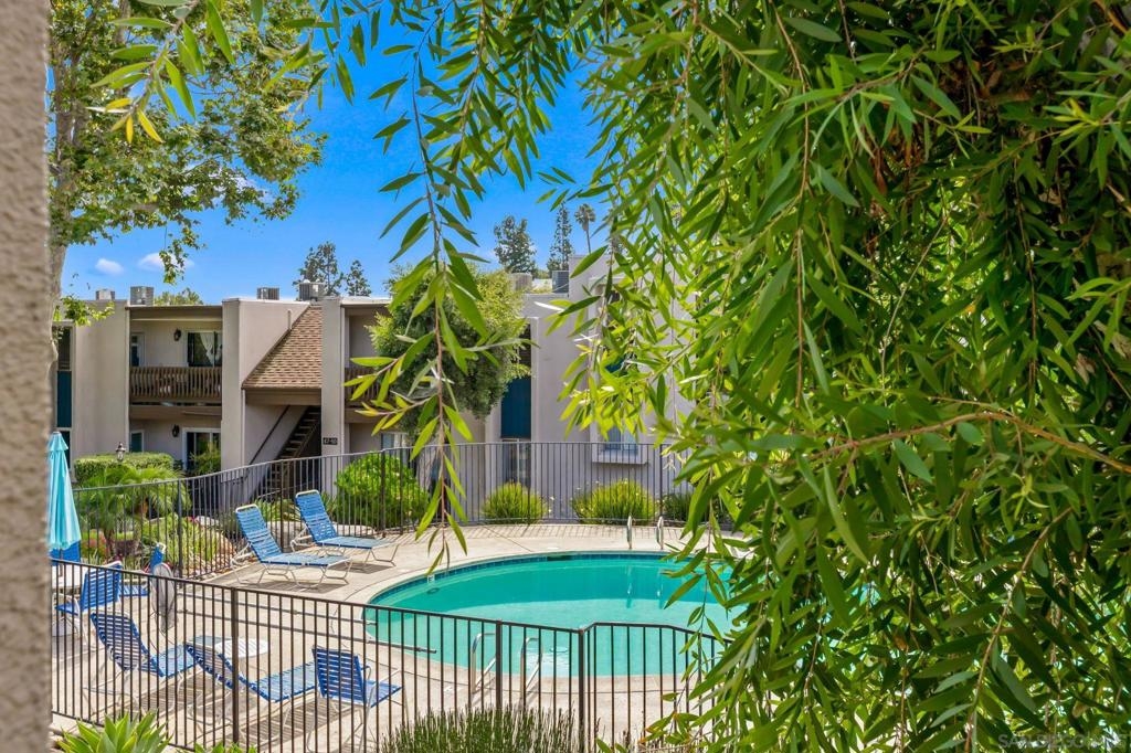 Welcome to the desirable garden community of La Miranda, known for its lush landscaping, tranquil water features, resort-style pool, and inviting clubhouse. Completely remodeled in 2023, this home features a modernized kitchen and updated bathrooms with fresh style and comfort throughout. Ideally positioned on the second floor, it boasts two private patios—one with sweeping views of the mountains to the east and another overlooking the serene gardens and pool. Inside, the cozy living room opens to a patio through sliding glass doors, creating the perfect spot to enjoy your morning coffee or the gentle breeze. The kitchen flows seamlessly into the living area and showcases upgraded appliances along with a pass-through window to the patio—ideal for entertaining. Don’t miss the stunning beamed ceiling in the dining area, adding elegance to every gathering. The spacious primary bedroom includes a walk-in closet, an en suite bathroom, and its own patio with mountain views, while the secondary bedroom also enjoys mountain vistas and ample closet space. Additional features include an assigned parking space, plenty of storage, and access to the community’s sparkling pool and spa, barbecue area, laundry facilities, and clubhouse complete with a pool table and fitness equipment. Conveniently located near shopping, Costco, restaurants, I-8, Lake Murray, and SDSU, this well-maintained community combines comfort, convenience, and charm.