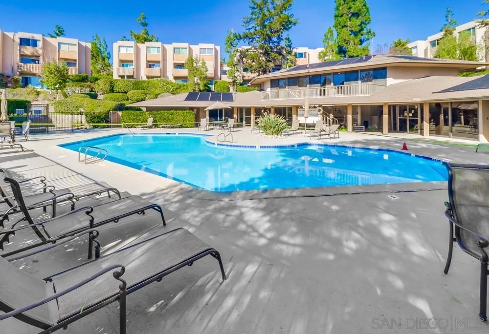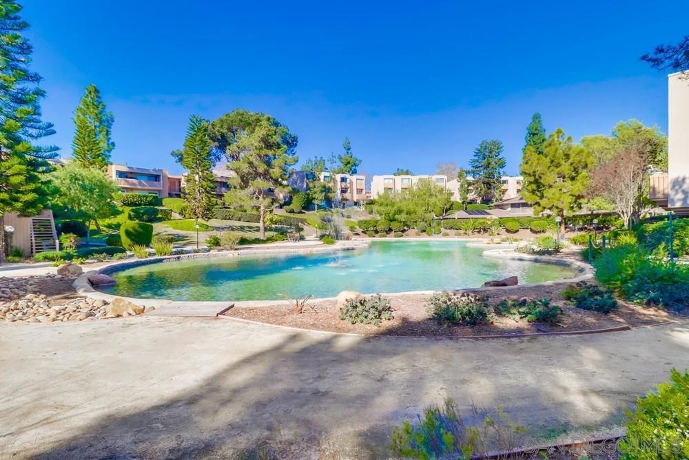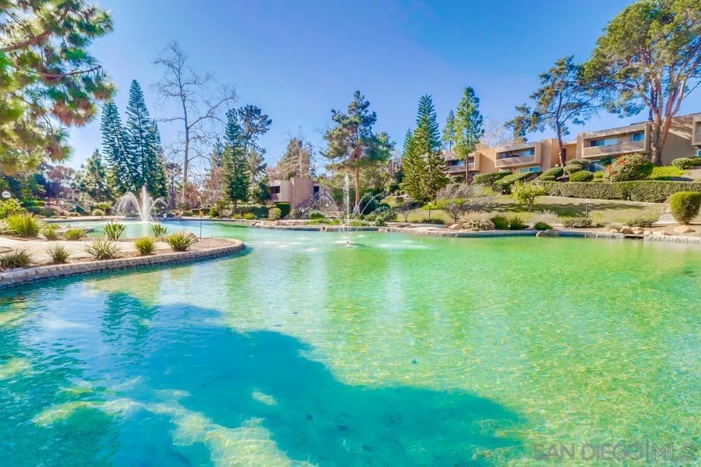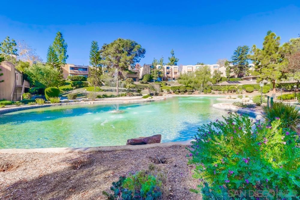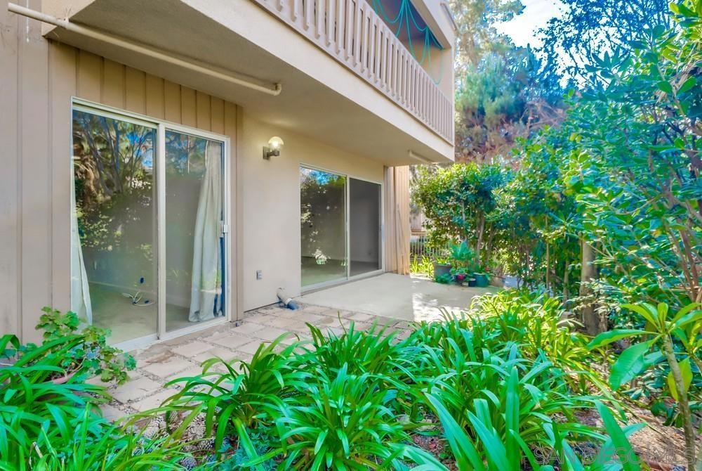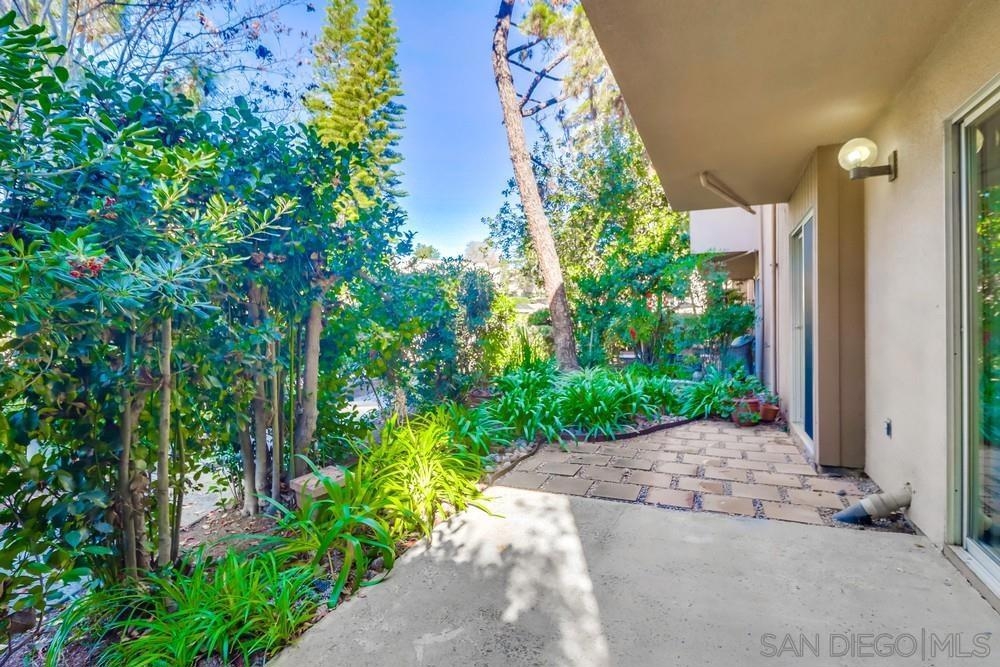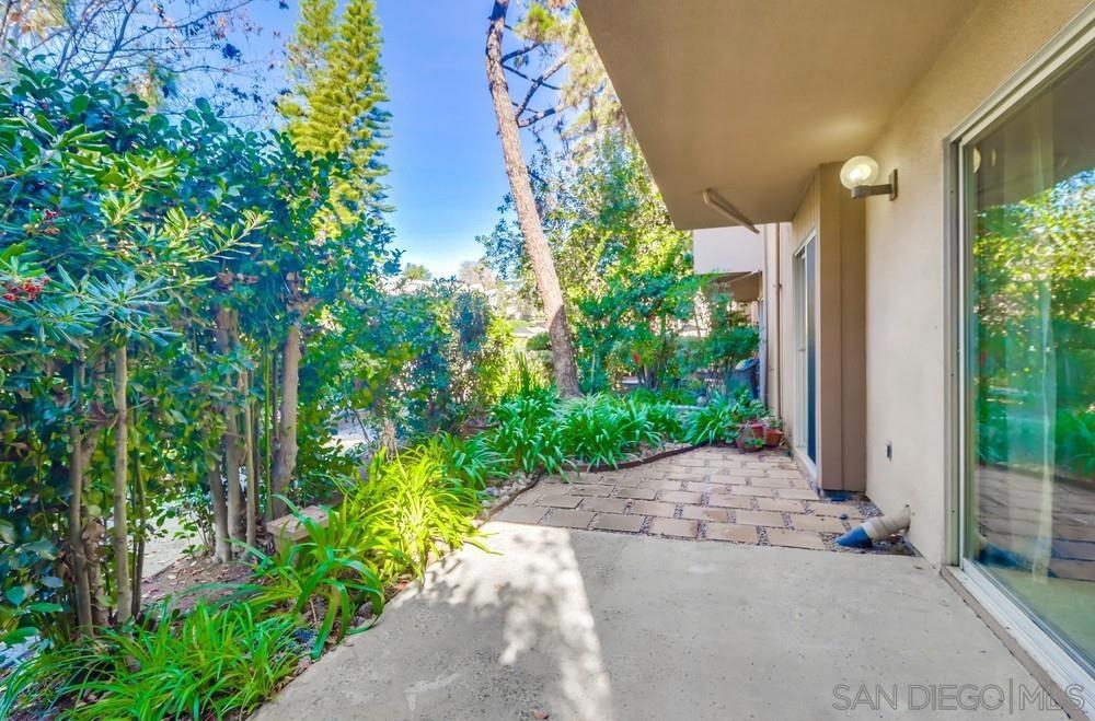 This ground floor, corner unit has serene parklike views. Sit on the oversized terrace listening to the sounds of the water fountains. Updated kitchen cabinets, recent remodeled bath, large sliding doors in living room and bedroom leading to the spacious patio. Very efficient floor-plan with large living, separate dining area and open kitchen. Complex has 5 pools, 4 spas, fitness center, tennis, basketball courts and laundry room. The parking space is close to front door making this single level condo a breeze to live in.