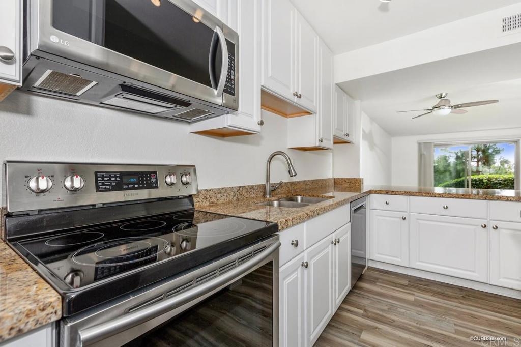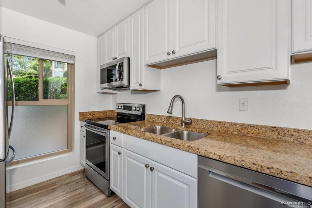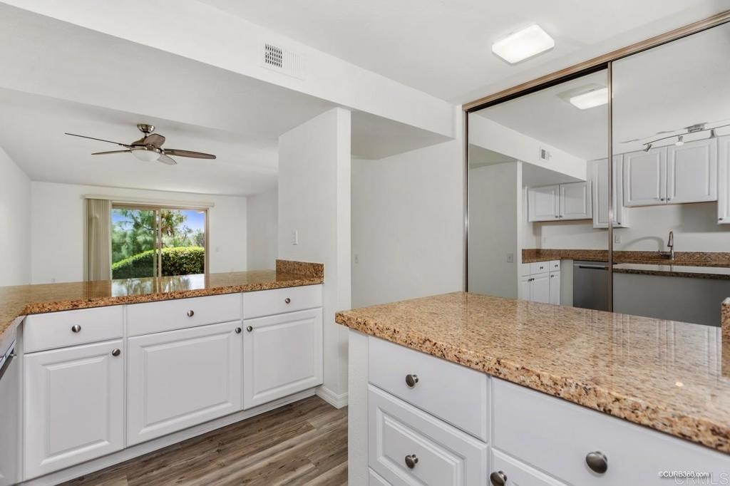 Beautifully remodeled single level 2br/2ba with no stairs is located in the Lake Park Complex which is a resort style complex with many amenities. Located next to Lake Murray/Mission Trails park with hiking, biking, fishing and more. This unit has been remodeled thru out featuring laminate flooring, dual paneled windows and sliding doors. Kitchen has been remodeled with granite counters, new white cabinets with lots of drawers for storage space. Kitchen has also been opened up with extra counter space & drawers next to refrig. Newer appliances, faucets and more. Breakfast bar, dining area & Living room with ceiling fan. New mirrored sliding doors in spacious hallway closet at entrance. Both bathrooms remodeled with new toilets, white cabinetry and corian counters, light fixtures, sinks, faucets. Master bath with walk-in shower. Master bath sink and mirror separate area from shower. 2nd bathroom has refinished tub. Each bedroom has walk in closets. Unit has central air & central heat. Freshly painted ready for your own decor. 2patio areas: a front patio at entrance, a private back patio overlooking the pool and garden pond with newer sliding doors. Patio access from living room and master bedroom. Lake Park complex sits on 24 acres of its own land. Sidewalks with lights, garden ponds with fountains, workout gym with newer equipment, shower and saunas. Lake Murray/Mission Trails Park great place to be for the 4th of July fireworks. Close to lake, shopping and restaurants. Short drive to Cowles Mountain, SDSU, Grossmont Mall, Costco, downtown La Mesa village and much more. EZ freeway access too.