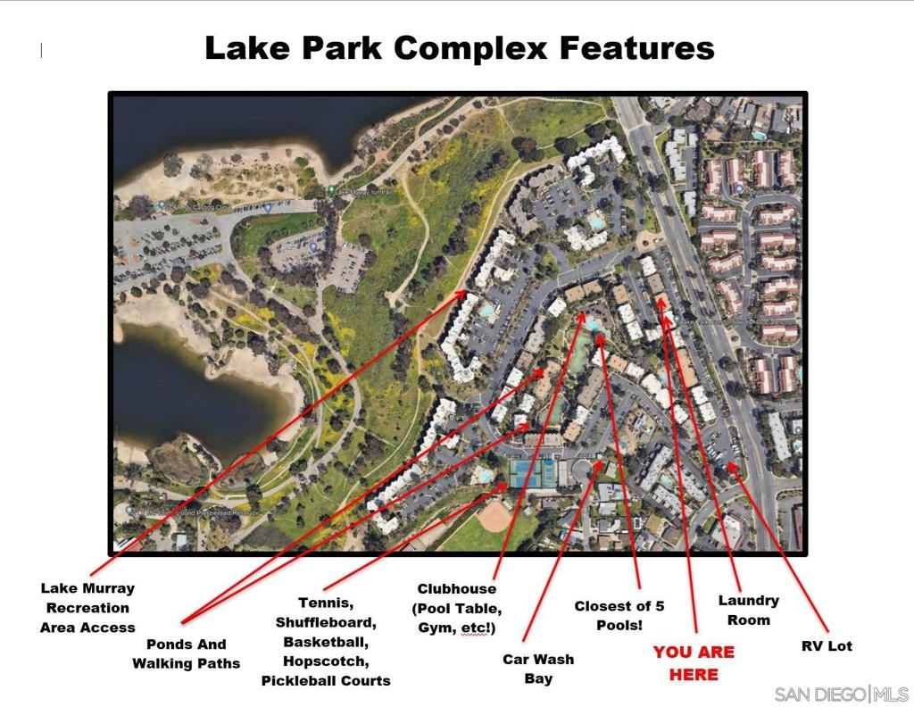 Light+Bright Southwest Facing End Unit “Garden” Condo on Top 2 Floors w ~Easterly Rear Exposure at Lake Park La Mesa…Steps from Lake Murray! 2 Bdrms, 1.5 Baths (model matches exist w 2.5 baths in the same space) Situated w No Other Bldgs in Front/Behind Creating Privacy/Open Feel. Adjacent Rec Paths (biking, hiking, running). Impressive Amenities: Lovely Grounds w Ponds/Fountains, 5 Pools, 4 Spas, Tennis, Pickleball, B-Ball+Even Hopscotch! Gym/Sauna, Pool Table ++! Walk to Shopping, Dining, Coffee Shops!
