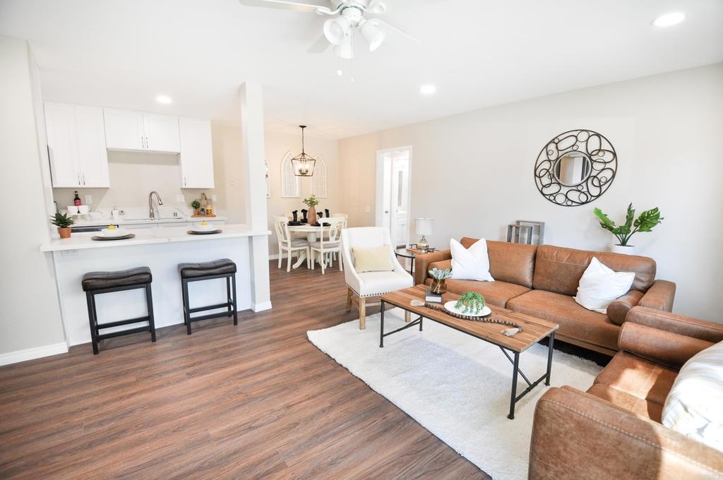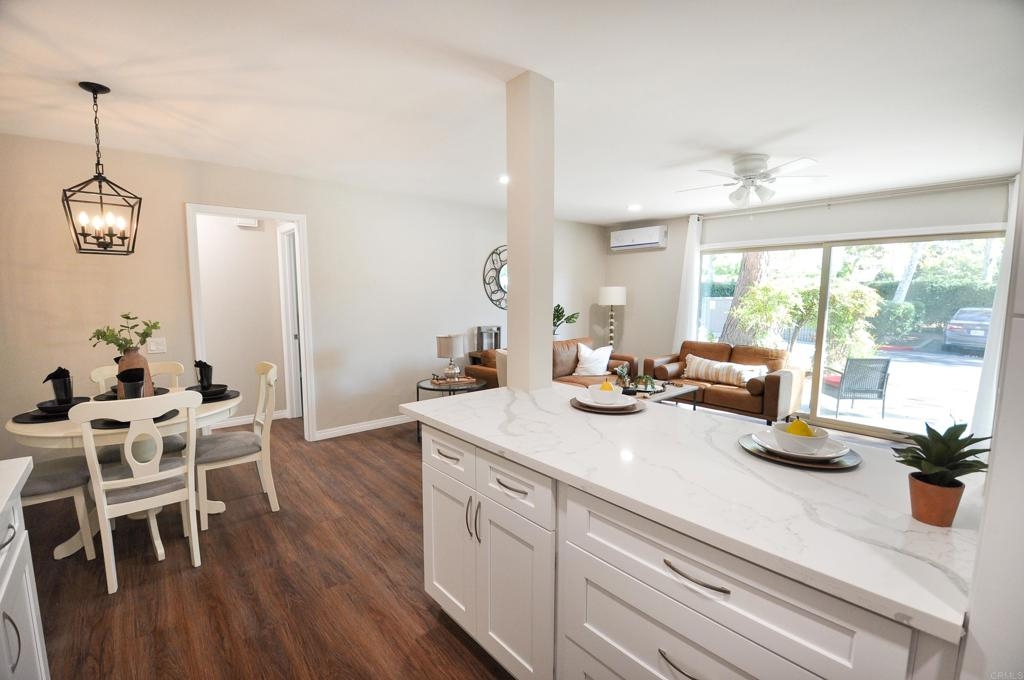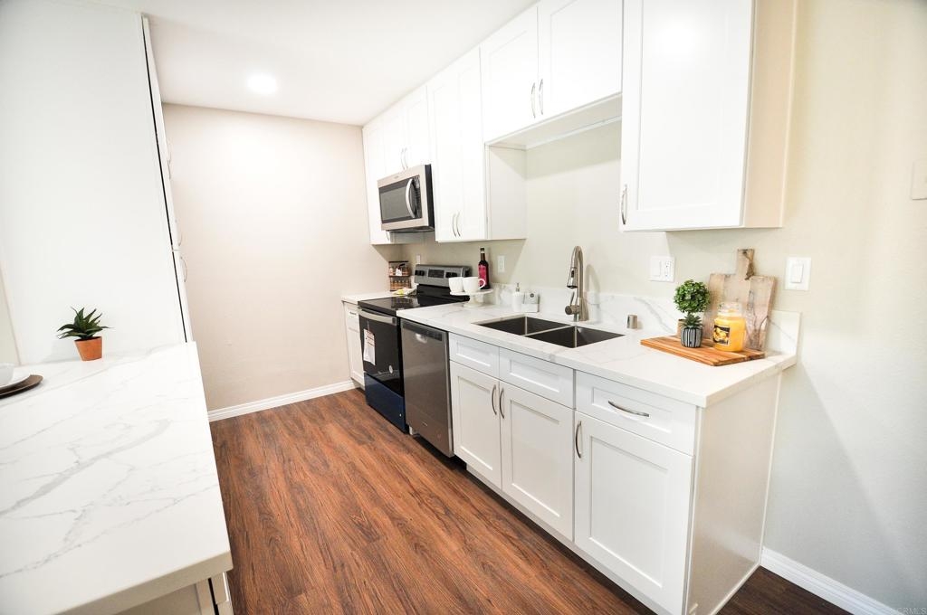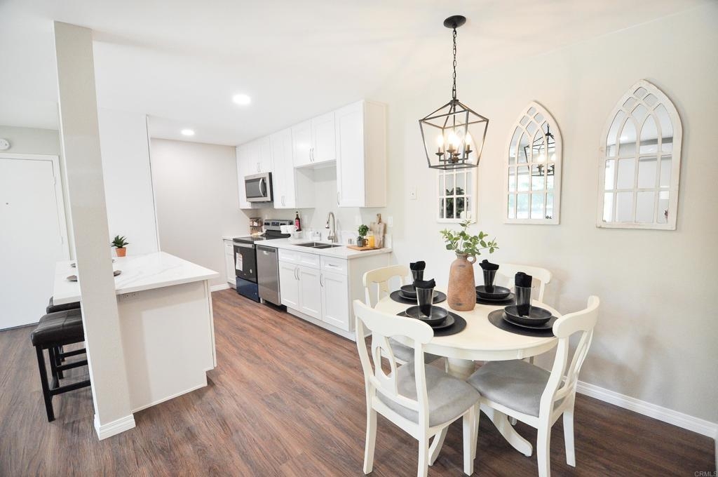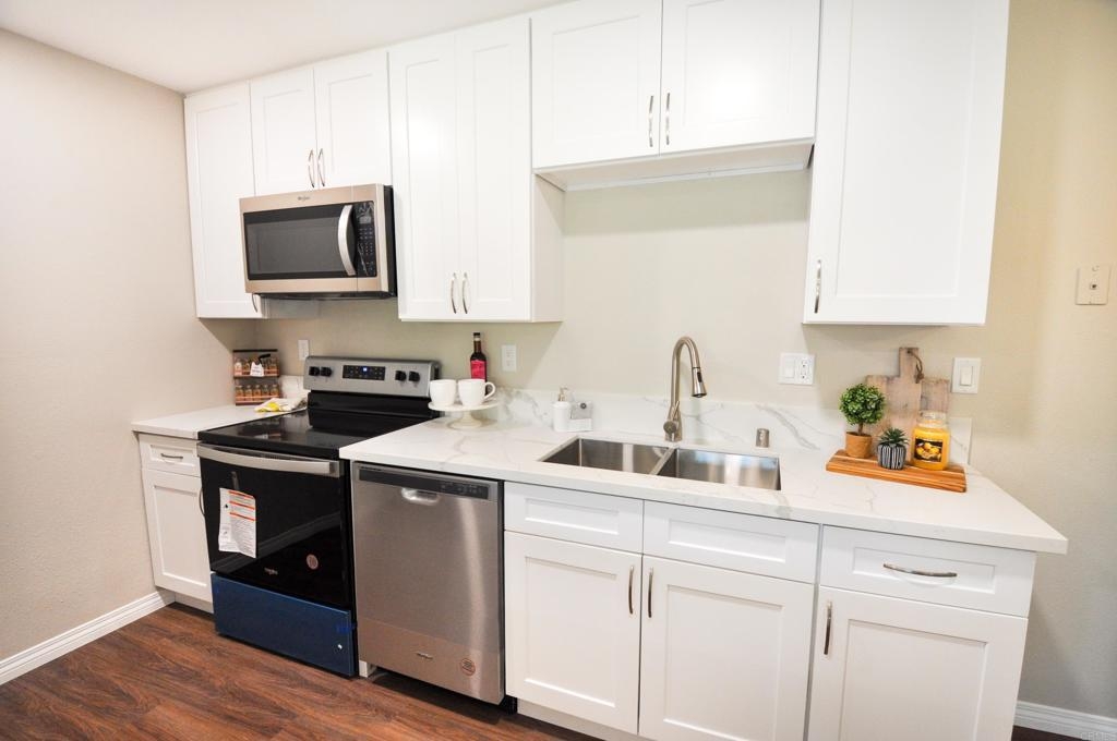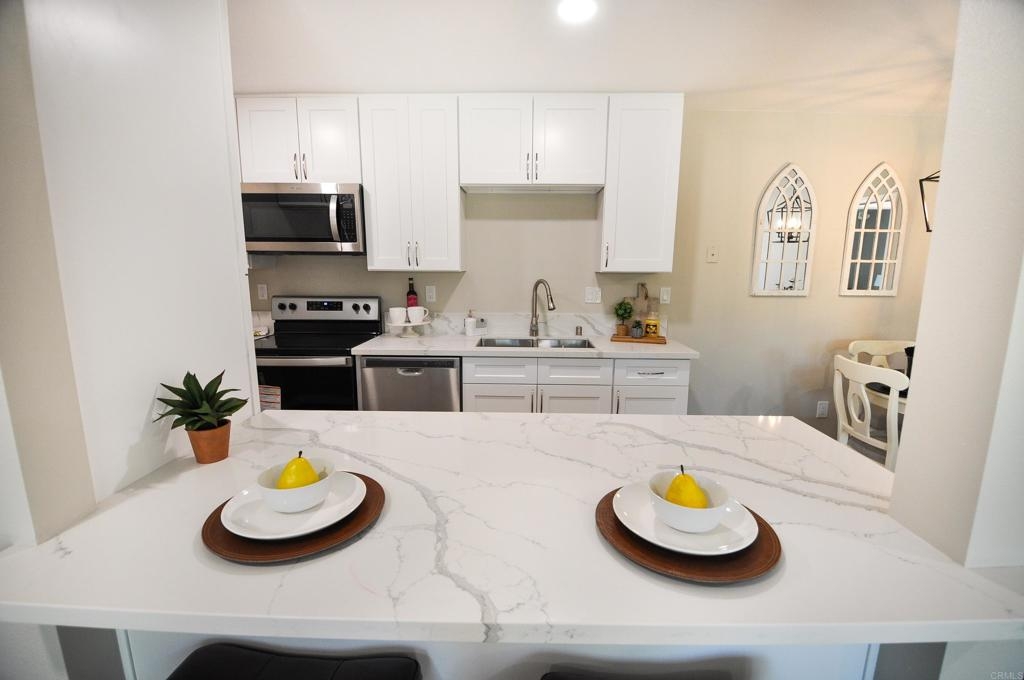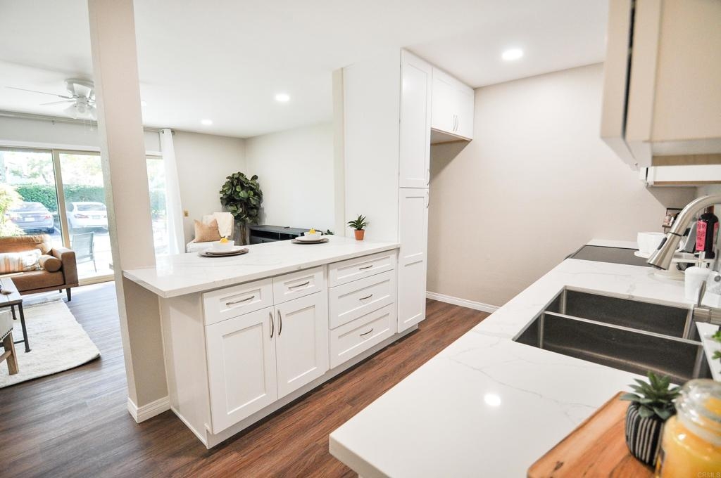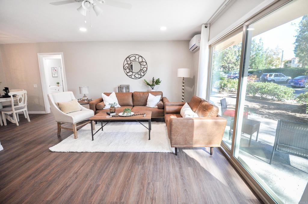 Seller to entertain offers between $349,900-$369,900. Stunning remodeled ground level condo in desirable park-like Lake Park community! Brand new kitchen has gorgeous Carrera Quartz countertops, stainless steel appliances, large pantry and room for a large refrigerator. Large open concept spaces provide ample room for large sectional in the living room and king size bed in the bedroom. New ductless heat and air mini-split system cools and heats the unit fast and efficiently. Extra large glass slider in the living room provides ample natural light and access to pretty patio area with HOA maintained landscaping. Many brand new upgrades include: new dual pane glass sliders, new paint, new luxury vinyl flooring throughout, recessed lighting, new mirrored closet doors in the bedroom, and water line installed for the refrigerator. Prime complex location provides easy short access to assigned parking spot, laundry and mail room, and the pool. HOA fee covers all utilities except electric, has optional parking for RVs, boats, motorcycles etc., pool, gym, and a car wash. Great La Mesa location close to Lake Murray, Mission Trails, and great restaurants and shopping. VA approved complex! Hurry to see this one!!
