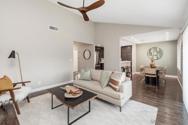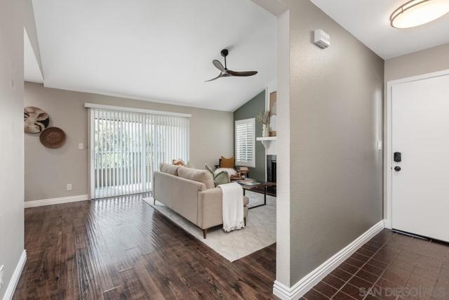 Meticulously maintained La Mesa masterpiece. Top floor end unit location with vaulted ceilings and abundant natural light. Distressed wood laminate floors | kitchen boasts quartz counters, herringbone backsplash, stainless steel appliances, reverse osmosis, LED accent lighting, adjacent dining area. Voluminous family room complete with fireplace/ ceiling fan/ recessed lighting. Sizable primary suite and secondary bedrooms with new plantation shutters. (See Supplement) New A/C pump, extra insulated dual pane windows limit exterior sound transmission significantly! Gorgeous hall and primary bath remodels- 24X12 tile/ marble niche/updated vanities/ Toto toilets. Tech-forward condo with Ring doorbell, keyless entry, smart lights/outlet, Sensi thermostat all controlled from your phone! Tons of storage with massive hallway closets, wall-to-wall reach-in closets in bedrooms, and full size newer side by side washer/dryer in the balcony enclosure. Excellent location walking distance to shopping, retail, restaurants, services, and easy I8 freeway access. 2 parking spaces- 1 uncovered and 1 carport both just outside the unit. HOA amenities/fee include pool/spa AND water, hot water, cable, trash, common area maintenance/landscaping. You do not want to miss this one!