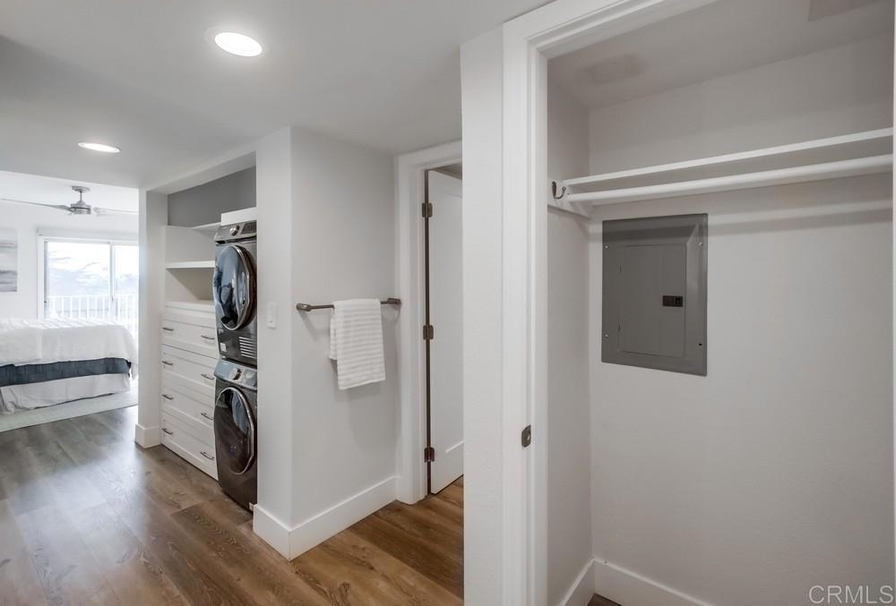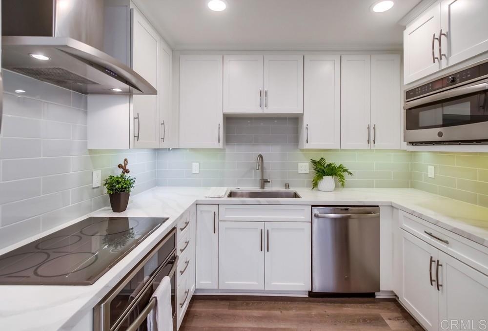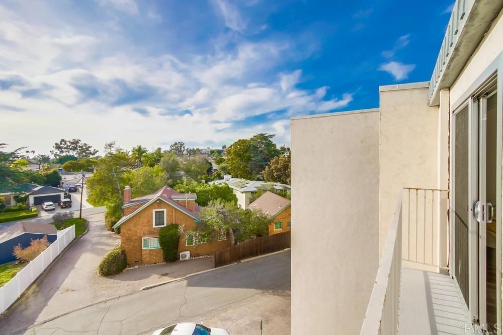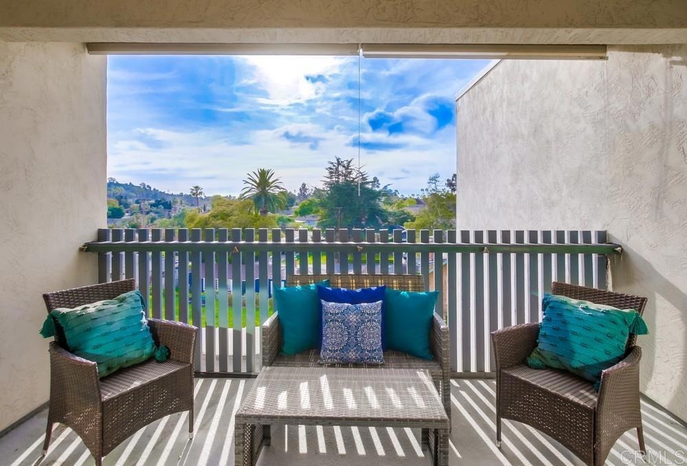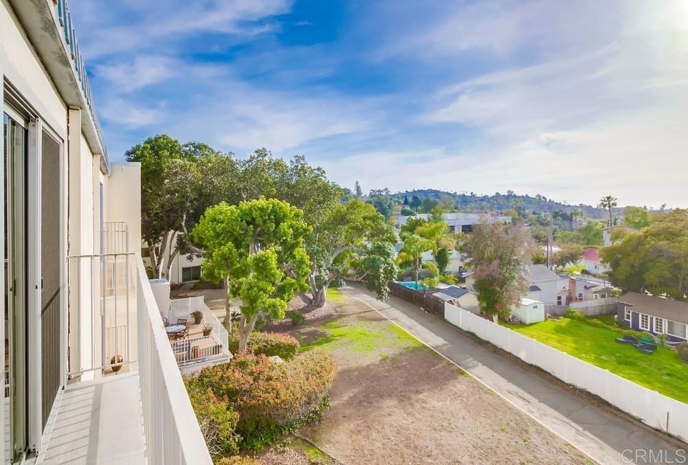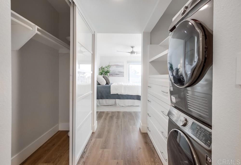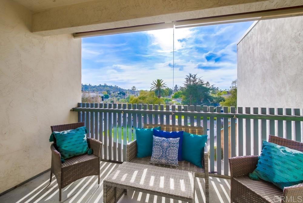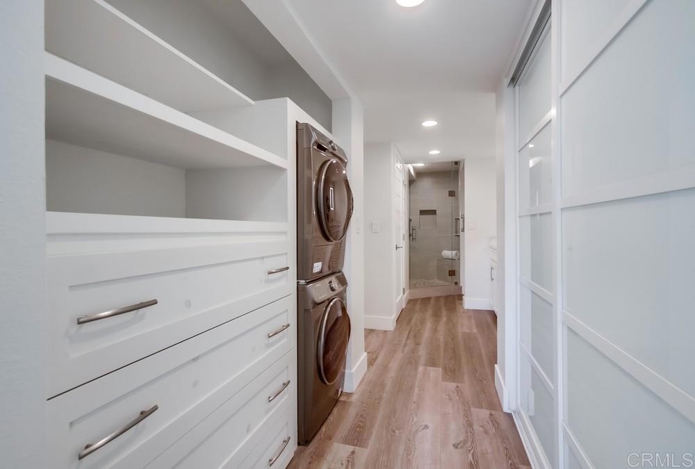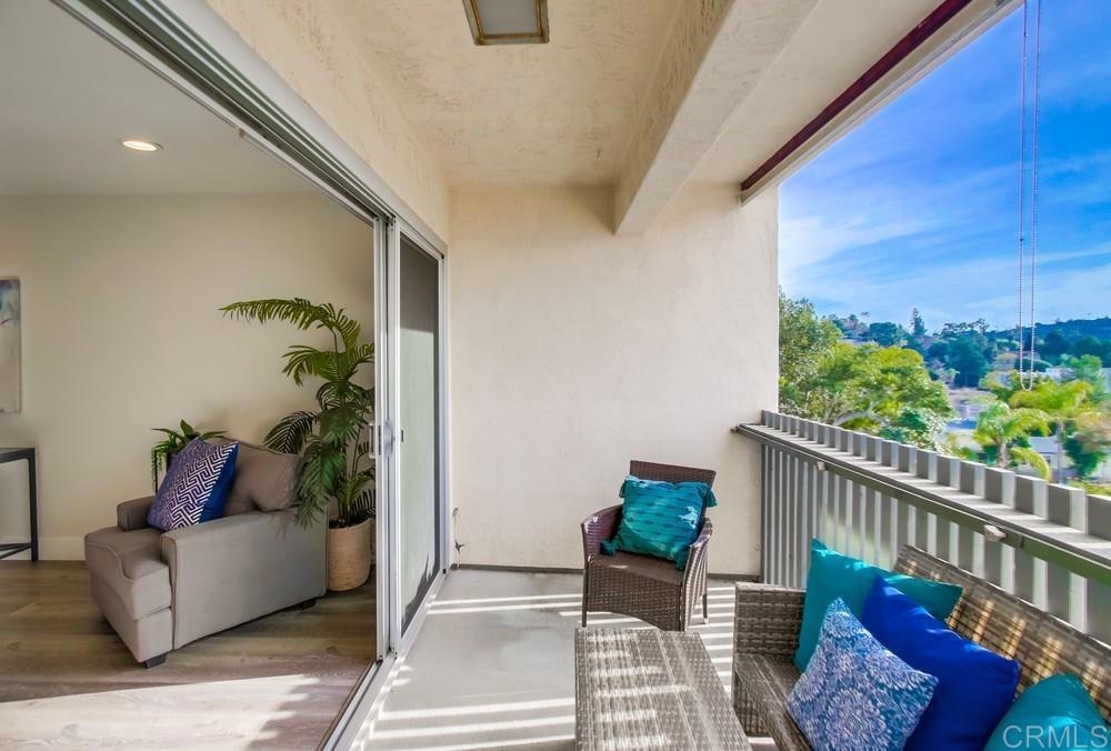Fabulous 2-Bedroom, 2-Bath Condo Near The Village of La Mesa! This spacious, light-filled top-floor unit features an open floor plan with upgrades throughout. The entryway offers newer custom-built storage cabinets that flow seamlessly into the modern kitchen, complete with stainless steel appliances and soft-close drawers. Step out to the private balcony off the living area and soak in stunning sunset views. Both bedrooms have sliding glass doors that open to a second balcony. Beautiful closet doors in each bedroom, and the primary bedroom has custom shelving and drawers for added storage. Enjoy the convenience of in-unit full-size stacked laundry. Adjustable recessed lighting adds a modern touch, while luxury vinyl plank flooring extends throughout the home. The updated bathrooms feature stylish walk-in showers. Additional highlights include two parking spaces and a storage area in the secure underground garage. The community offers a small library, shaded patio, extra laundry room, elevator access to all floors, and a rooftop sun deck perfect for dining and entertaining.