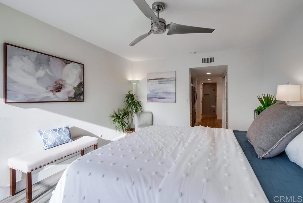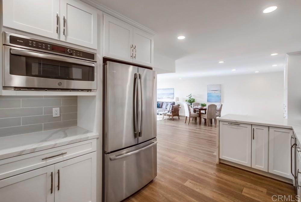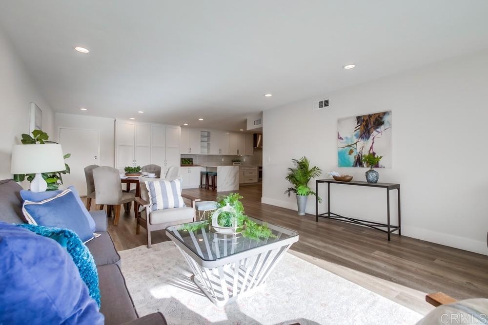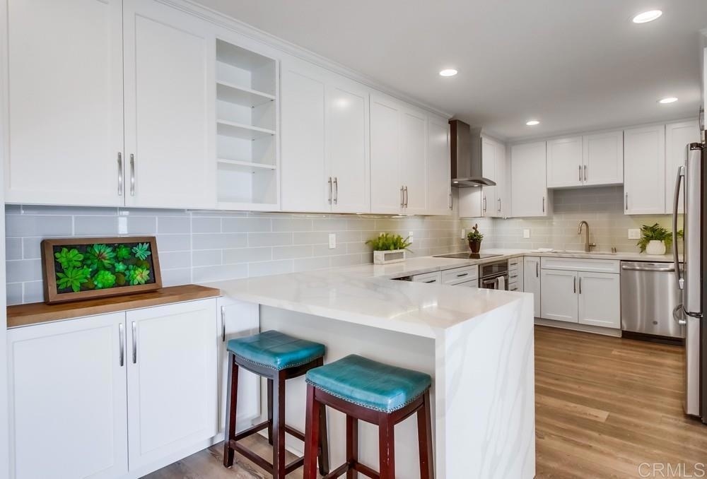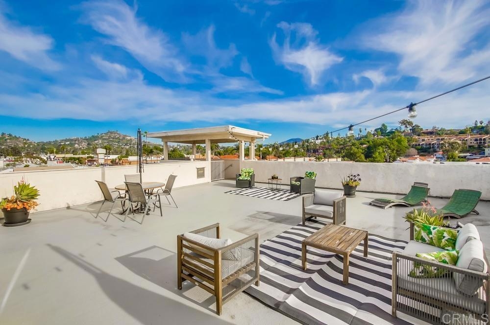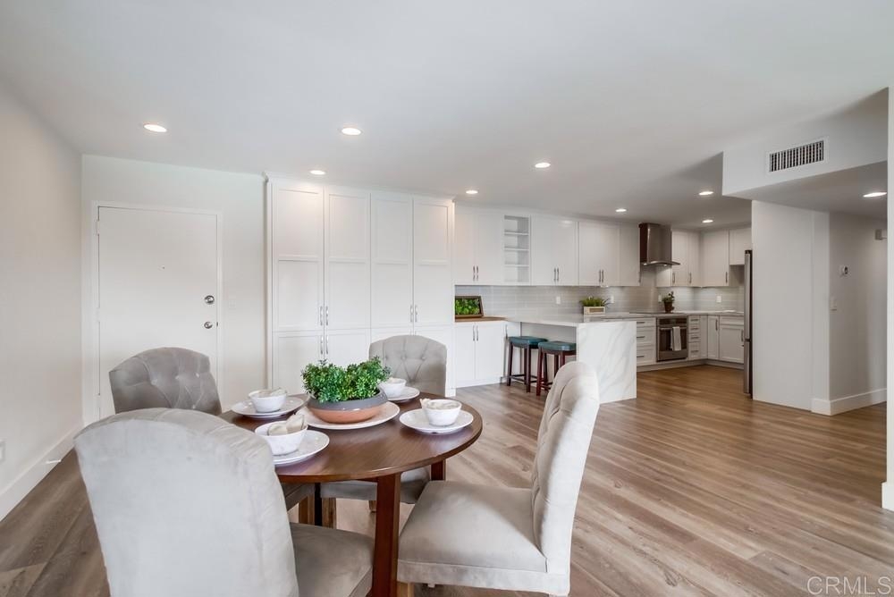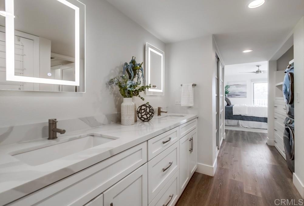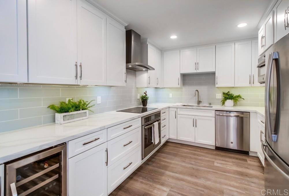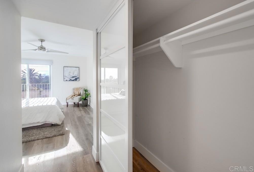 Fabulous 2-Bedroom, 2-Bath Condo Near The Village of La Mesa! This spacious, light-filled top-floor unit features an open floor plan with upgrades throughout. The entryway offers newer custom-built storage cabinets that flow seamlessly into the modern kitchen, complete with stainless steel appliances and soft-close drawers. Step out to the private balcony off the living area and soak in stunning sunset views. Both bedrooms have sliding glass doors that open to a second balcony. Beautiful closet doors in each bedroom, and the primary bedroom has custom shelving and drawers for added storage. Enjoy the convenience of in-unit full-size stacked laundry. Adjustable recessed lighting adds a modern touch, while luxury vinyl plank flooring extends throughout the home. The updated bathrooms feature stylish walk-in showers. Additional highlights include two parking spaces and a storage area in the secure underground garage. The community offers a small library, shaded patio, extra laundry room, elevator access to all floors, and a rooftop sun deck perfect for dining and entertaining.