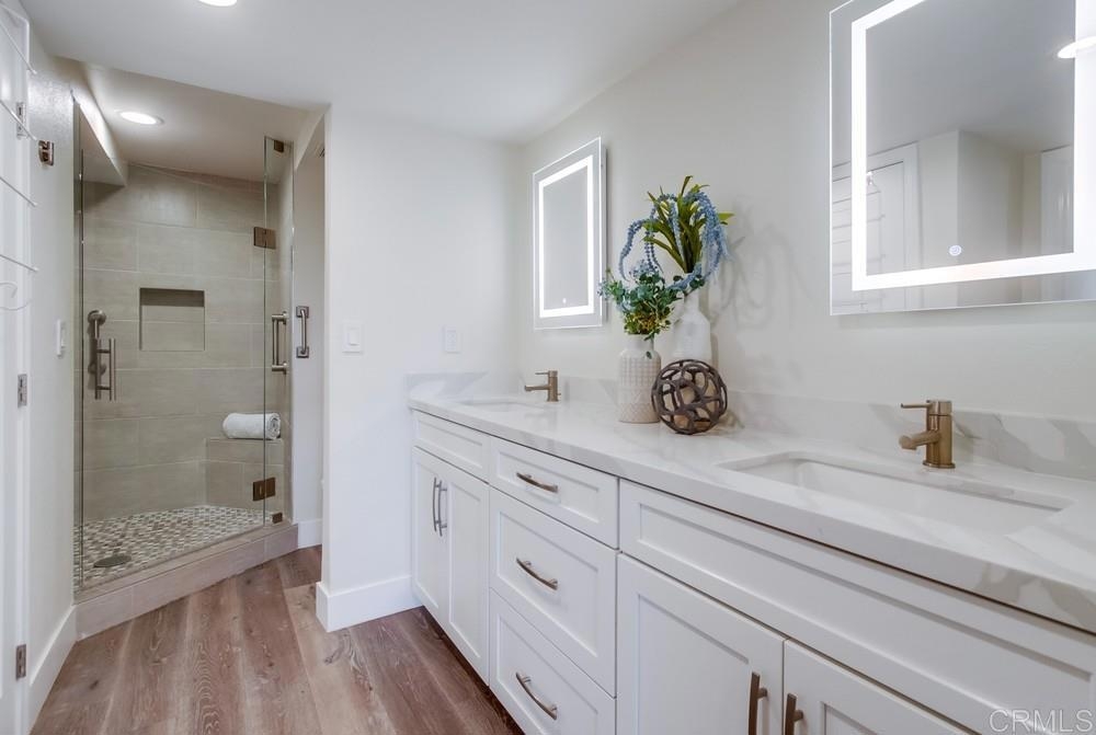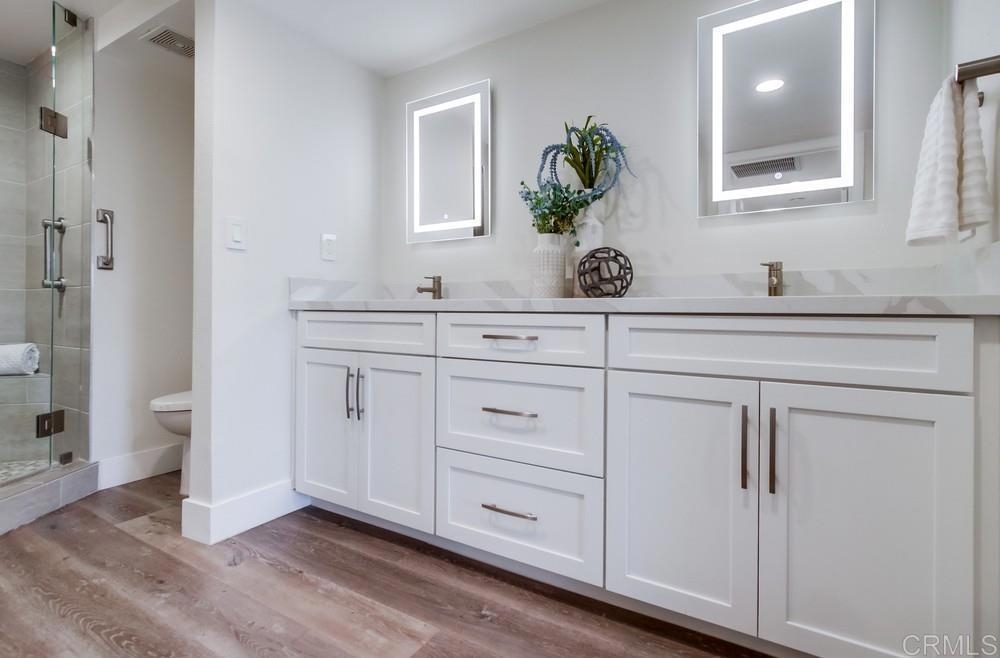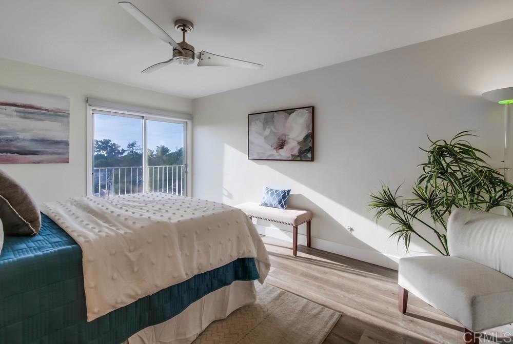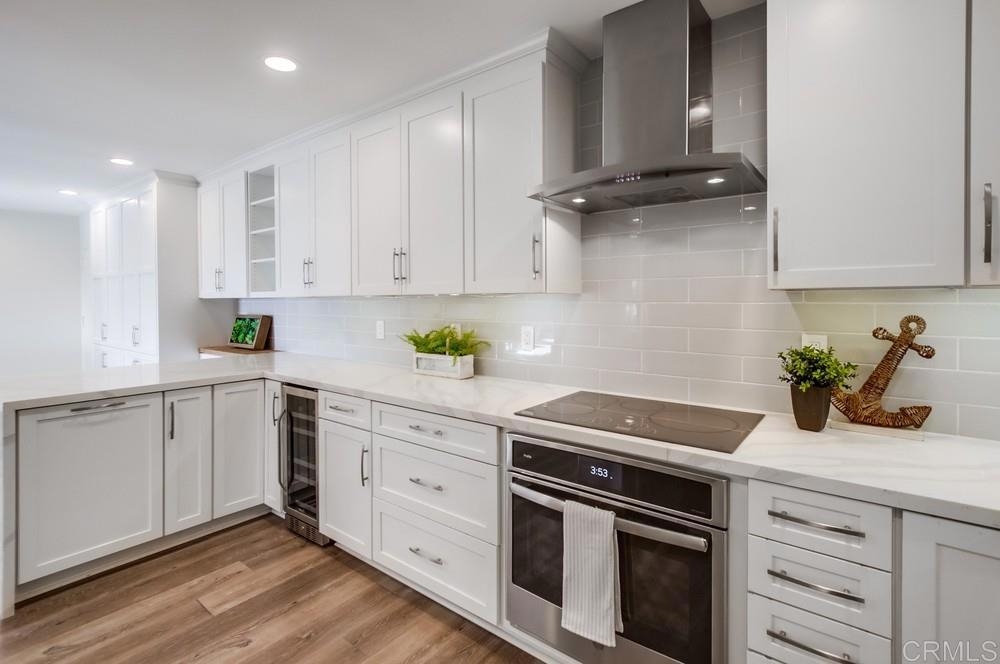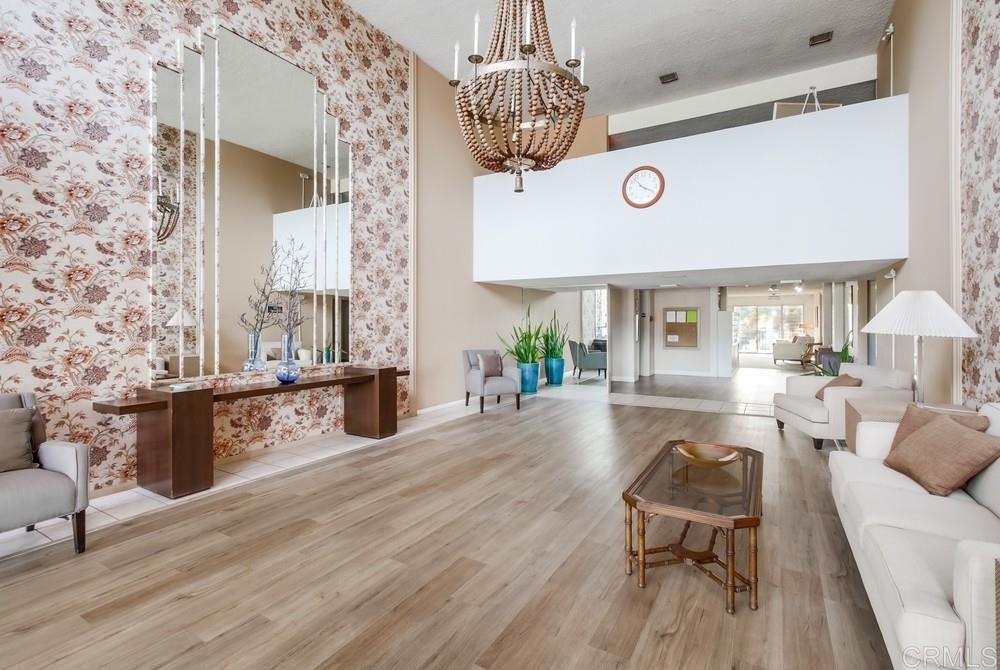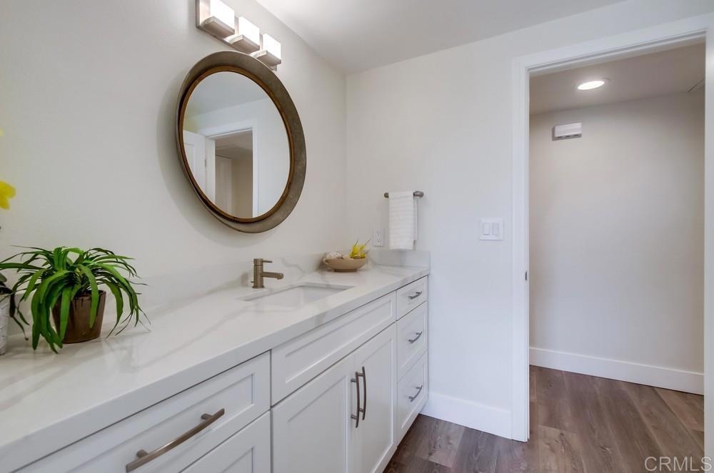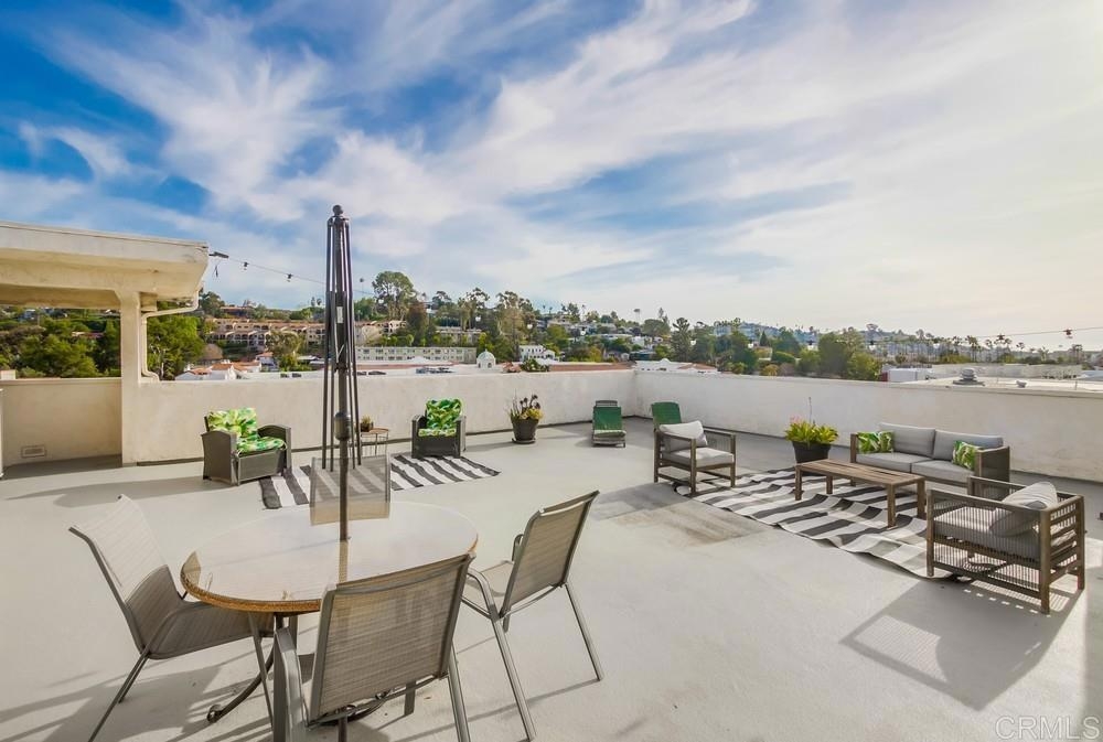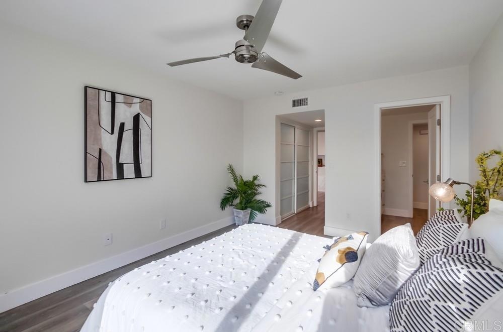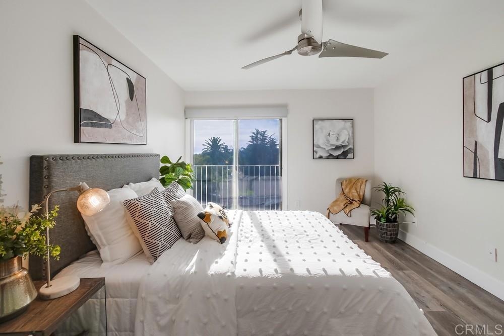 Fabulous 2-Bedroom, 2-Bath Condo Near The Village of La Mesa! This spacious, light-filled top-floor unit features an open floor plan with upgrades throughout. The entryway offers newer custom-built storage cabinets that flow seamlessly into the modern kitchen, complete with stainless steel appliances and soft-close drawers. Step out to the private balcony off the living area and soak in stunning sunset views. Both bedrooms have sliding glass doors that open to a second balcony. Beautiful closet doors in each bedroom, and the primary bedroom has custom shelving and drawers for added storage. Enjoy the convenience of in-unit full-size stacked laundry. Adjustable recessed lighting adds a modern touch, while luxury vinyl plank flooring extends throughout the home. The updated bathrooms feature stylish walk-in showers. Additional highlights include two parking spaces and a storage area in the secure underground garage. The community offers a small library, shaded patio, extra laundry room, elevator access to all floors, and a rooftop sun deck perfect for dining and entertaining.
