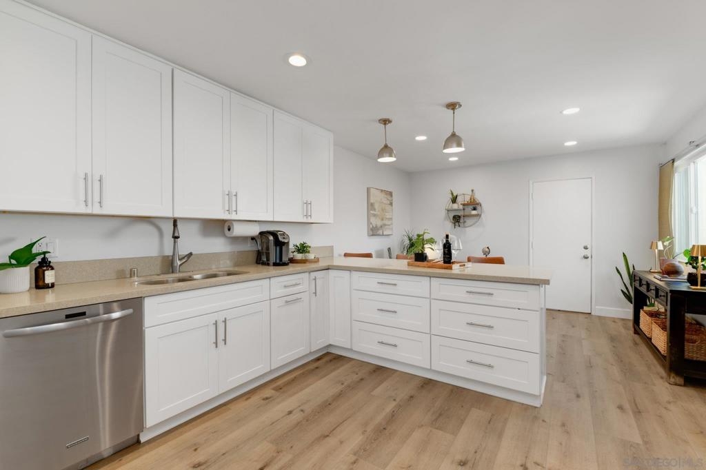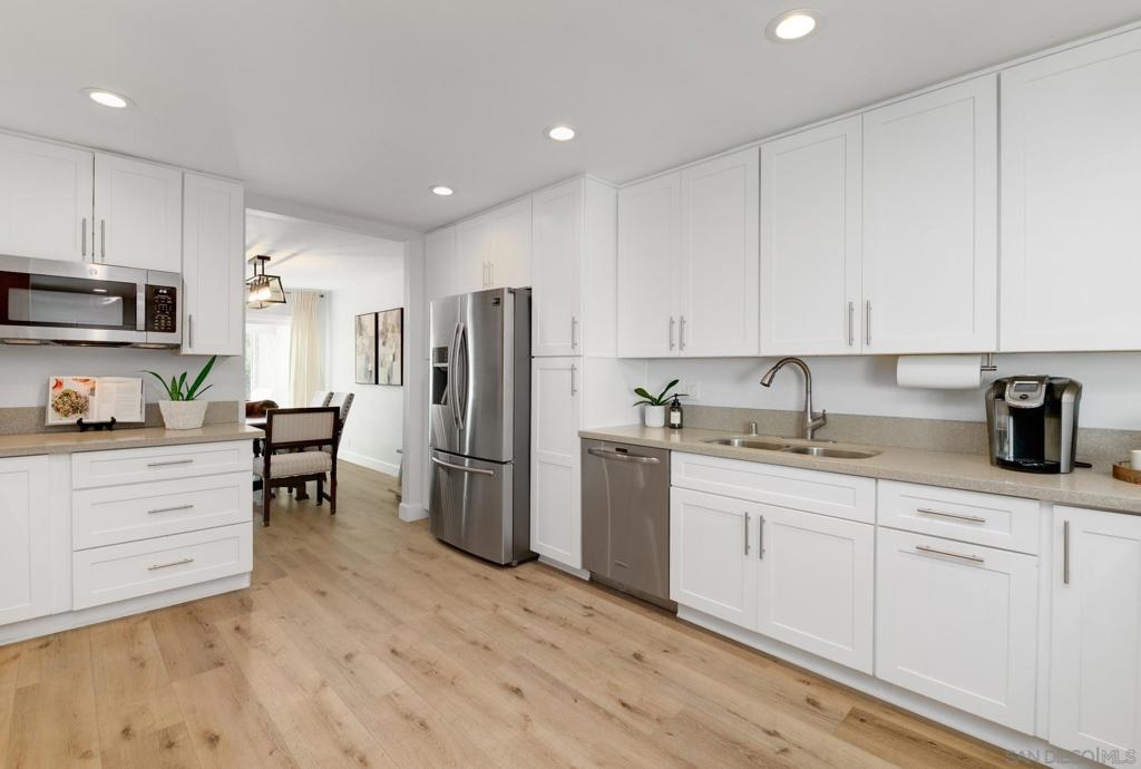 Discover the perfect blend of contemporary sophistication and tranquil living in this stunning, fully renovated 3-bedroom, 2.5-bathroom townhome. Nestled in a premier, quiet La Mesa enclave with no through access, this home offers a true sanctuary just a short stroll from the scenic trails and recreation of Lake Murray. Step inside to an airy, open floor plan bathed in natural light, featuring gorgeous new wide-plank flooring and recessed lighting throughout. The chef-inspired kitchen is a showstopper, boasting crisp white cabinetry, sleek countertops, and stainless steel appliances. Whether you're hosting in the formal dining area or working from the integrated home office nook, the layout is designed for modern lifestyles. The spacious living room is anchored by a classic fireplace, with peaceful views from the large picture window of the tree-filled back patio. This lush outdoor oasis is perfect for al fresco dining under the stars. Upstairs, the primary suite serves as a peaceful retreat, complete with an updated ensuite bath and a private balcony overlooking the greenery of large mature trees. Beyond the home’s interior, practical luxury is refined by the attached two-car garage, providing seamless direct access and ease of entry. Enjoy exclusive community amenities, including a sparkling pool, jacuzzi, and a lush private park perfect for afternoon escapes. While the neighborhood offers a quiet retreat, life’s essentials are just moments away; enjoy the rare convenience of having Vons, local dining favorites, and transit options within walking distance.