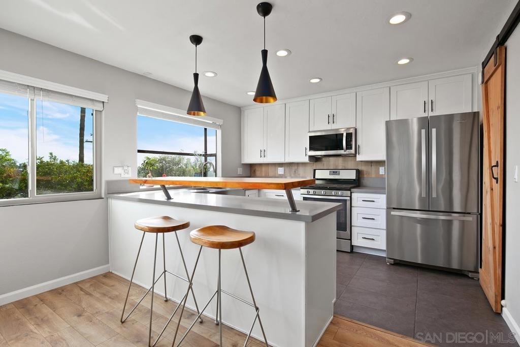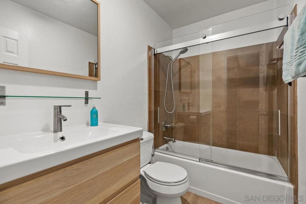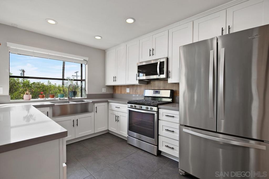 This 3 bed, 2.5 bath, tri-level townhouse is picture perfect and move-in ready! The interior vibe is that of a downtown industrial chic loft, while the private outdoor patio space is located in a tranquil park like setting with a pool, spa, mature trees and meandering pathways. The home features a fully remodeled kitchen with two pantries, quartz counter tops, stainless steel farmhouse sink, stainless steel appliances and slate tile flooring; updated dining area with custom brick accent wall; fully remodeled upstairs bathroom and updated half bath; custom barn doors on pantries and master bath and Ring doorbell; newly installed whole house "Quiet Cool" fan, "smart" thermostat; slate tile entry way and luxury vinyl plank flooring run throughout the home. This townhouse has its own private two car garage with custom cabinetry, and the complex features ample visitor parking. It is conveniently located next to Aztec Park and close to shopping, restaurants and transportation. Easy access to the 8/805/163/5 freeways; 10 minutes to Mission Valley, 15 minutes to downtown, 20 minutes to Mission Beach. Complex Features: , Sewer: Sewer Connected Topography: LL