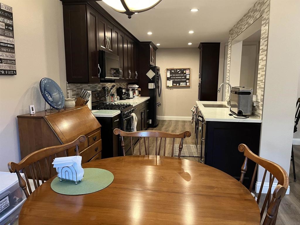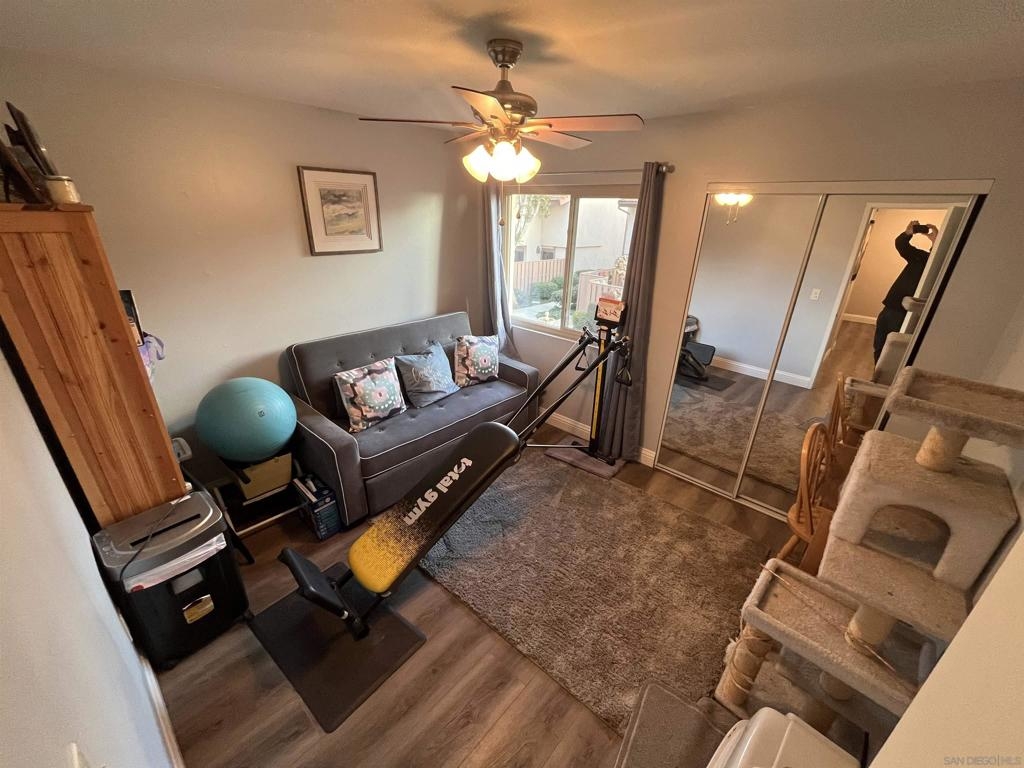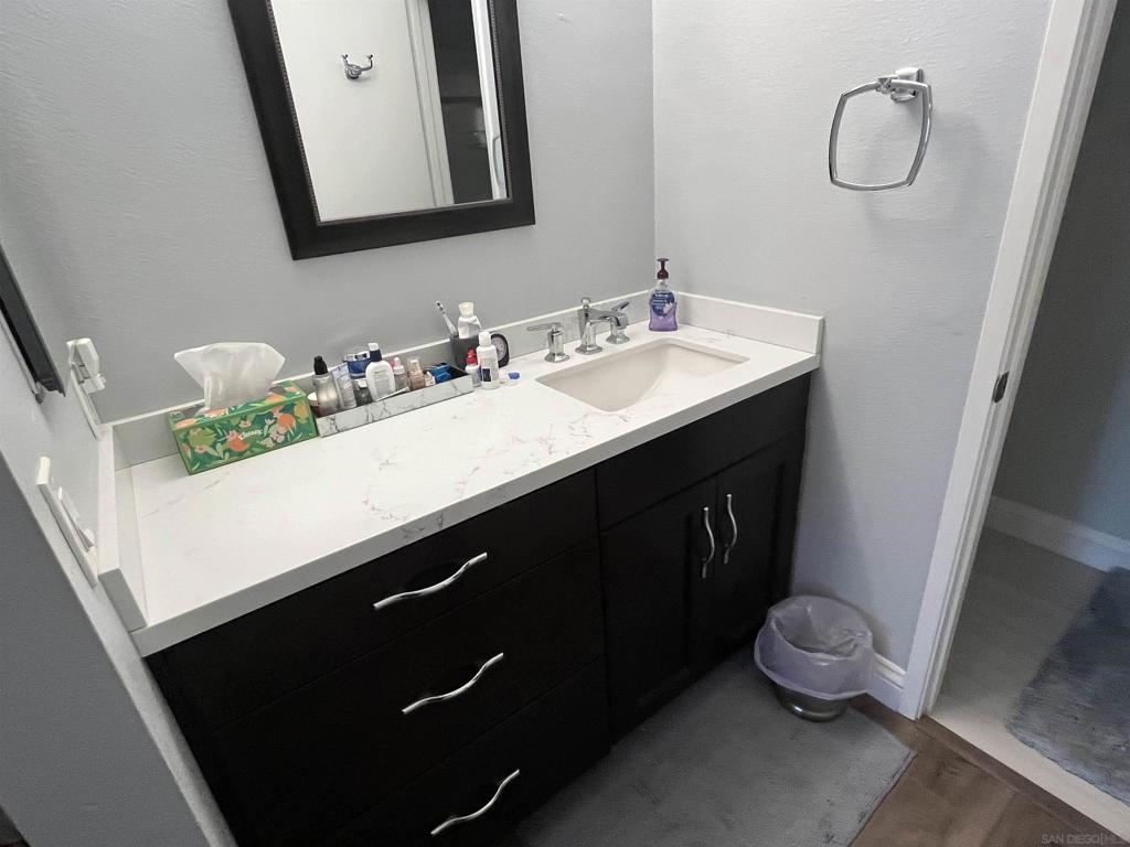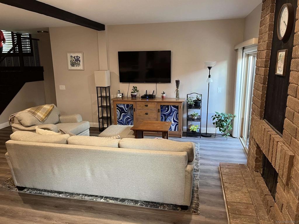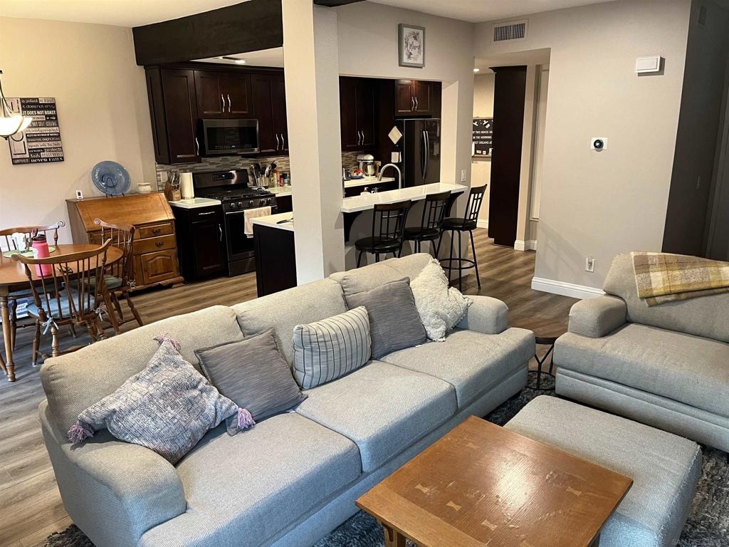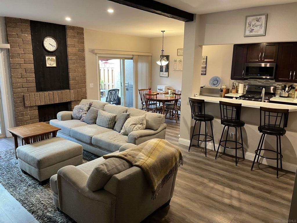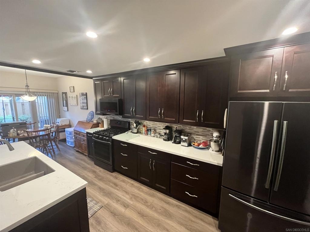 Spacious remodeled highly upgraded 3 bedroom 2.5 bath end unit located in the desirable Woodlands complex. 2 car garage with direct access to home. Attractive slow close kitchen cabinets with quartz counter tops, fireplace, dual pane windows, vaulted ceilings, mirrored closet doors, laminate flooring, ceiling fans, balcony off master bedroom, recessed lighting, upgraded staircase, private patio great for BBQ's and entertaining. The refrigerator, washer & dryer convey. Upgraded heater and newer AC unit. Great location within complex and close to community pool and Aztec Park.
