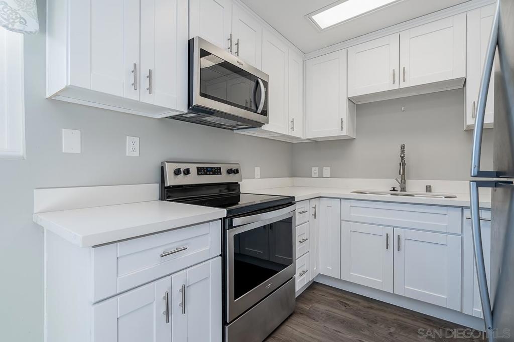 Rare availability in Villa Elena. This property is a true La Mesa gem near the Village, top rated schools, critically acclaimed eateries, shopping, public transportation, and nearby SDSU. In addition to the many unit updates, a separate storage closet is available on the ground level. This end unit was recently remodeled with neutral colors, wide planked laminate flooring & quartz countertops. Also features an "end unit" parking spot with no parking space to one side. Turn-key ready for fast move-in. Quartz countertops, unique vanity light fixtures, stainless steel appliances, wide planked laminate flooring and updated cabinetry throughout. Complex Features: ,,, Other Fees: 0 Sewer: Sewer Connected Topography: LL