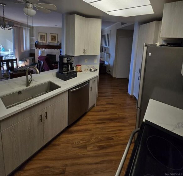 REDUCTION IN PRICE!! Fees include 500 MB INTERNET, PREFERRED CABLE WITH SHOWTIME, HBO & THE MOVIE CHANNEL. WATER, TRASH, SECURITY. GREAT PARKING. Welcome to the Village!! This property is centrally located in the heart of La Mesa. This spacious single floor unit has an open floorplan with 2-year-new remodeled kitchen and new flooring, NEW WINDOWS AND SLIDING DOOR. The extra-large covered patio not only has lovely views of La Mesa, but provides an incredible cross breeze felt throughout the unit. Brand new forced air cooling/heater unit installed just two months ago. The generous Master suite features a double sink vanity. You will be steps away from boutique shops, restaurants, a weekly farmer's market, grocery store and steps to the La Mesa Trolley stop. Yearly activities include Octoberfest, car shows and a welcoming Village vibrant atmosphere.